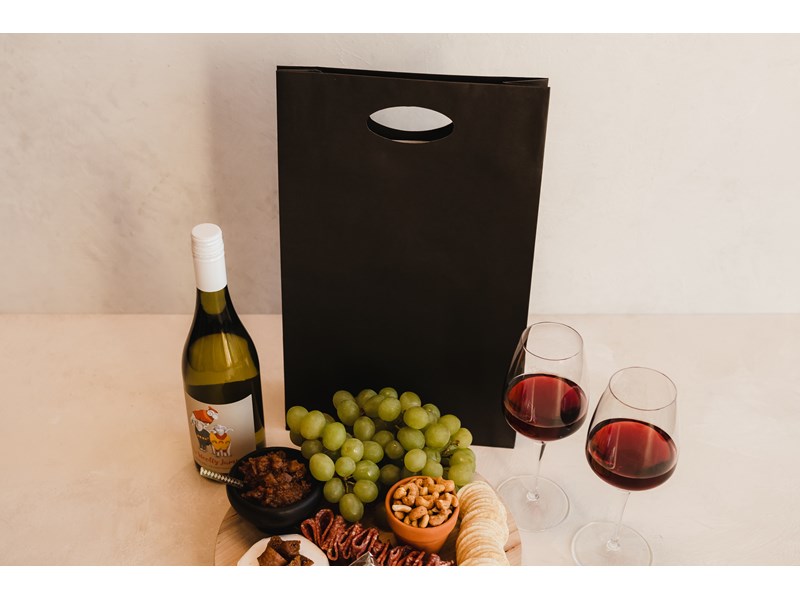 Die cut handle wine bags give a simple yet sleek presentation that will enhance your cellar door experience. Made from strong & durable black coloured kraft paper that is recyclable and reuseable. Reinforced base and handle suitable for three wine bottles. Sold in quantities of 100 per outer.