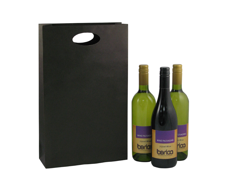Wine Bag for three Bottles with Die Cut Handle, 225L x 90W x 420H mm, Black