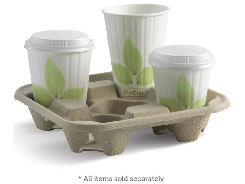 - Cup carry trays are made from 100% post-consumer recycled paper pulp