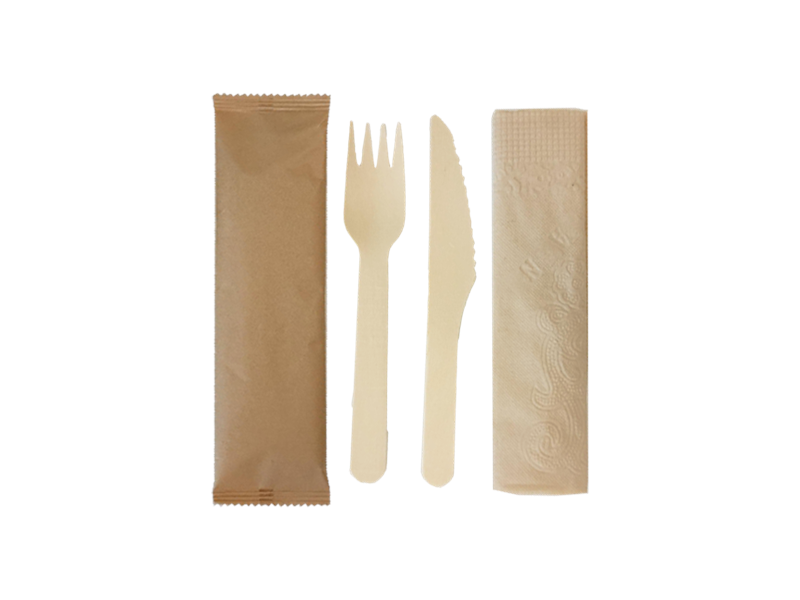 16 cm knife, fork and napkin wooden cutlery set. This takeaway cutlery set is compostable and carbon neutral. A more sustainable alternative to plastic cutlery sets. Sold in quantities of 400 per outer.