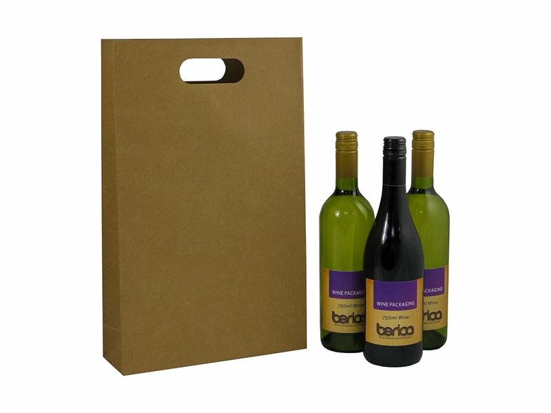 Wine Bag for three Bottles with Die Cut Handle, 225L x 90W x 420H mm, Natural Kraft