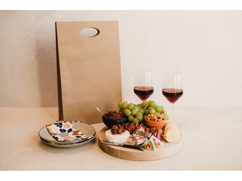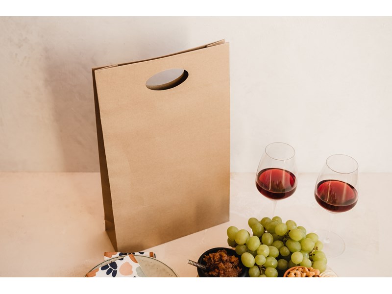 Die cut handle wine bags give a simple yet sleek presentation that will enhance your cellar door experience. Made from strong & durable kraft paper that is recyclable and reuseable. Reinforced base and handle suitable for three wine bottles. Sold in quantities of 100 per outer.