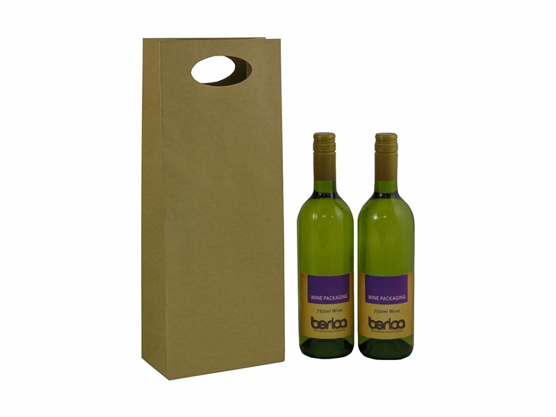 Wine Bag for two Bottles with Die Cut Handle, 170L x 90W x 420H mm, Natural Kraft